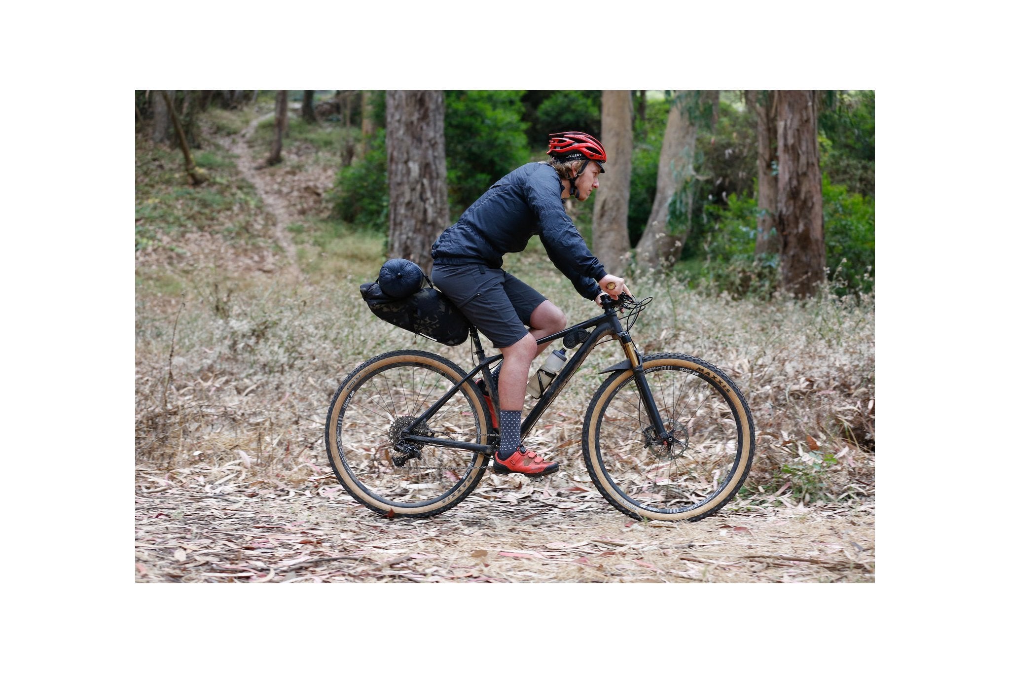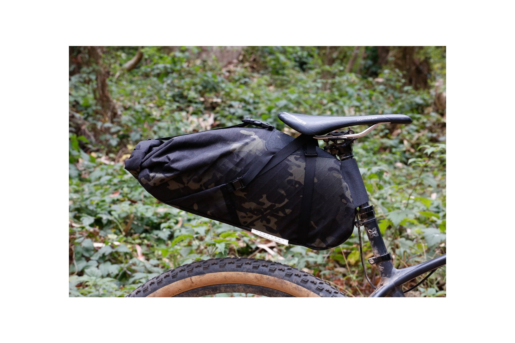 This bag is meant for your light, large volume items like a sleeping bag, tarp, and clothes. This bag will have a solid feel and handles the bumpy stuff like a boss because 360° internal plastic frame that helps the bag maintain it shape. Its rugged metal cam buckles means secure, no-slip connection points. Along with a durable, weatherproof construction, it also has good thigh clearance with room to get behind the saddle. This is a no-frills work horse with one strap for compression and extra gear.